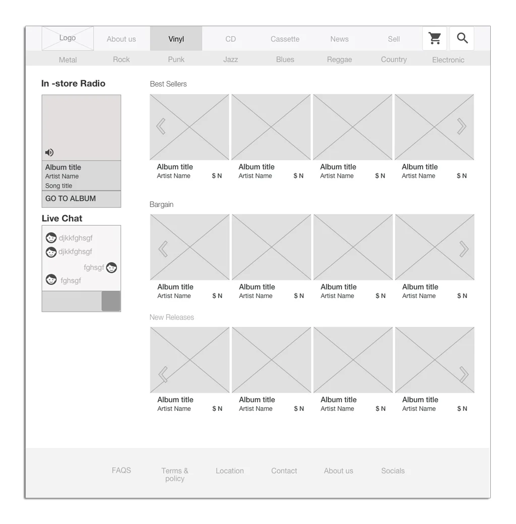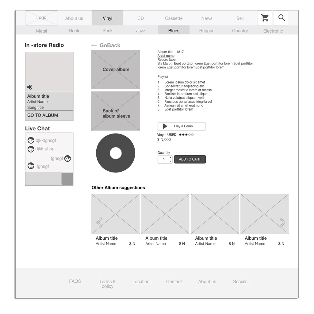 Based on the research I set the scenarios and tasks, focused on browsing music and providing an efficient checkout process. Based on the target persona, the website needs to provide a unique online shopping experience.