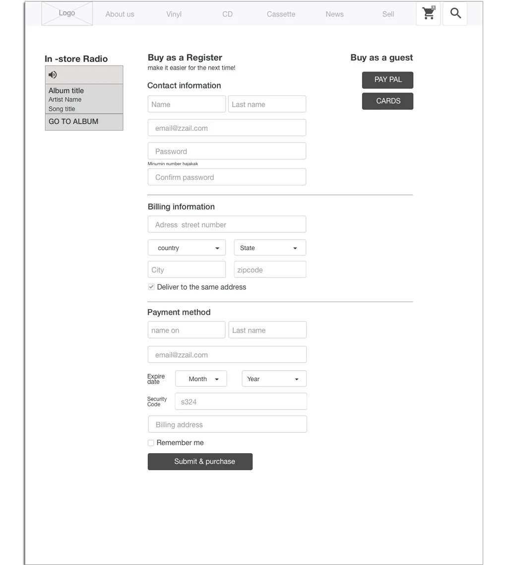 For the first iteration the design of the checkout process, has a review of your cart, the interaction sidebar and a form.The form has two sections for information: personal information and payment methods.